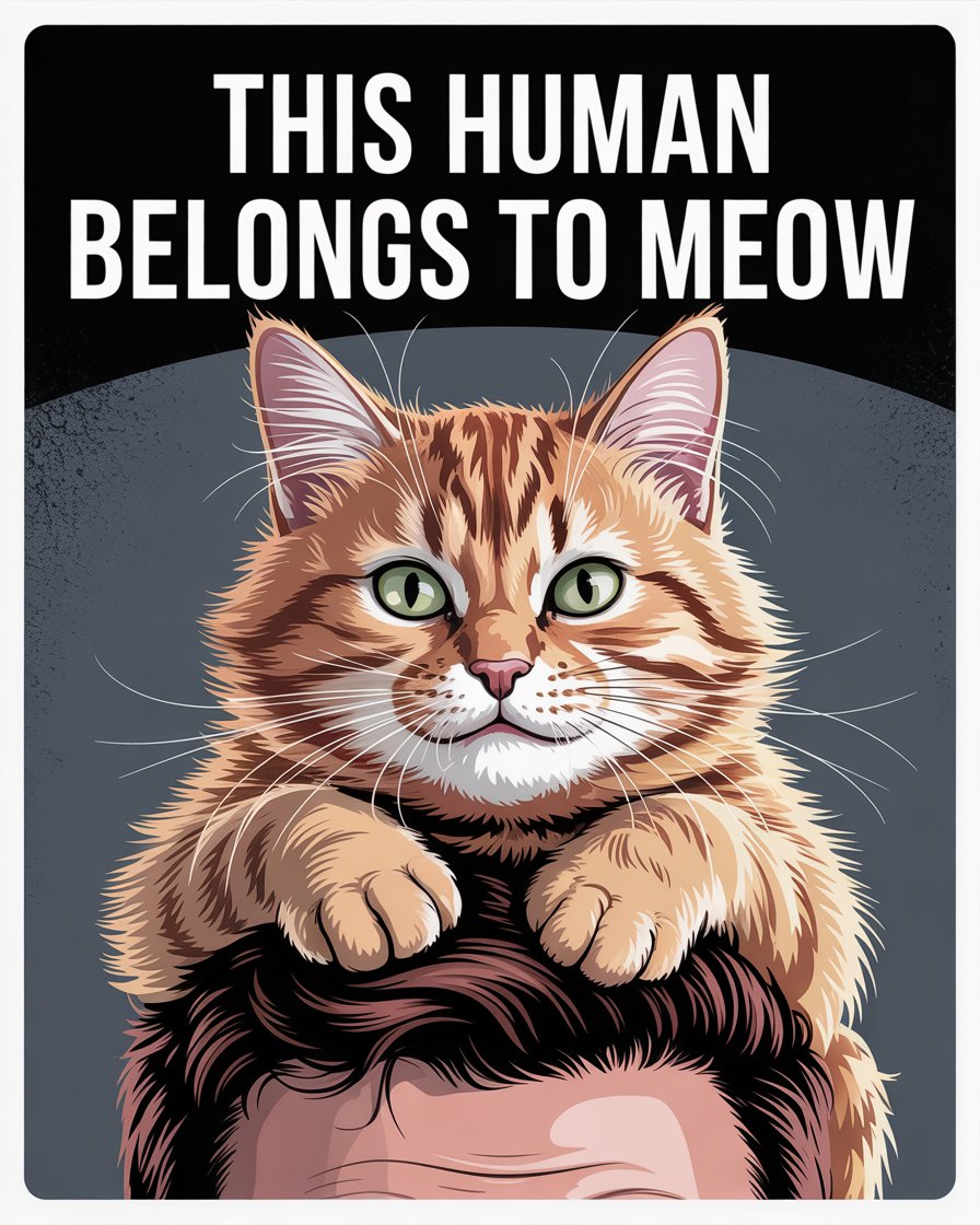 Featuring a charming ginger tabby perched on a human's head and the playful phrase “This Human Belongs to Meow”, this shirt is a purr-fect blend of humor, style, and pet love.